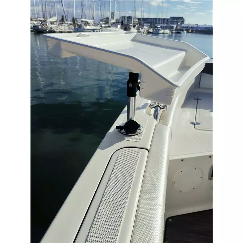 Cette planche à découper sur crosse est l’accessoire indispensable pour la préparation de vos appâts, gambas, filets de maquereaux, lanières de seiches ou d’encornet et également pour tirer les filets de poissons en toute sécurité.Réalisée en polypropylène traité UV, elle se nettoie facilement et la matière plastique n’absorbe pas les odeurs et ne se déforme pas.La crosse s’adapte à tous les porte-cannes encastrables du marché, ( 90°,15°,30°) elle se compose d’une bague de blocage réglable et d’un cardent à son extrémité pour un maintien optimal dans le porte-canne. La jonction entre la tablette et la crosse est réglable pour un positionnement horizontal de la tablette quelque soit l’inclinaison du porte-canne dans lequel elle est posée. Ce réglage permet également un rangement facile de la tablette hors utilisation.Pour la sécurité, les angles sont arrondis.Des emplacements sont prévus pour le positionnement d’une pince et d’un couteau.