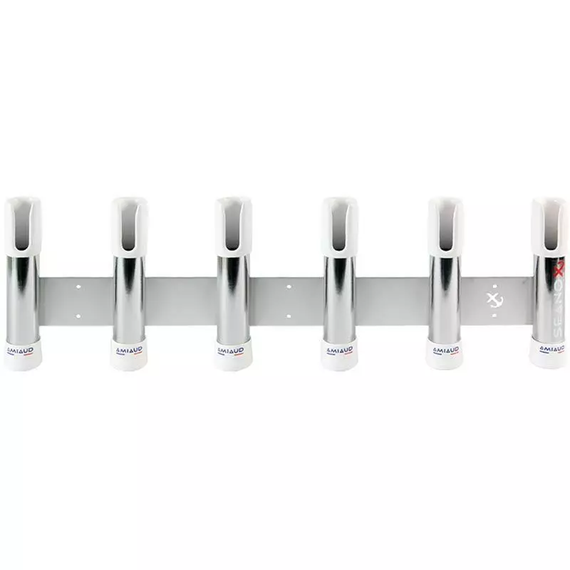 Possibilité d’adapter 3 fixations inox marine soit balcon pour 1 et 2 porte-cannes en montage « dos-à-dos » soit fixations sur glissière pour plat-bord :