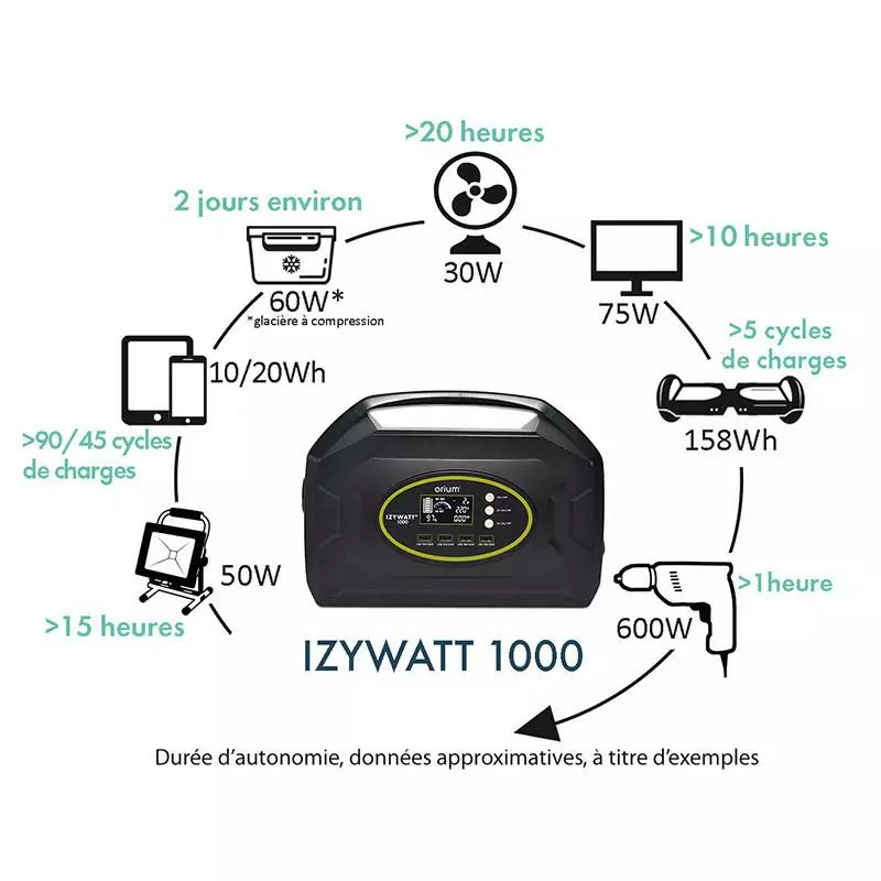 2. Alimenter (en direct) : lampes d’éclairage à LED, télévision, réfrigérateur 12V, ventilateur 12V, radio, outils de bricolage jusqu’à 1000W, compresseur, pompe de bassin…